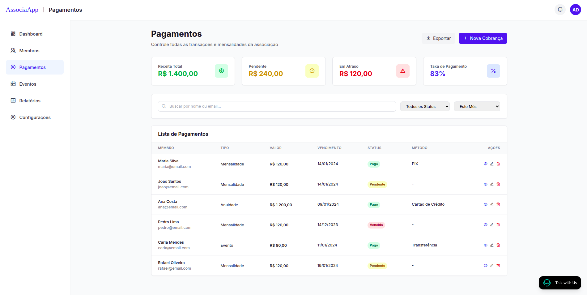 Cadastre e gerencie todos os pagamentos de seus associados com facilidade, oferecendo múltiplos métodos de pagamento e controle de inadimplência.